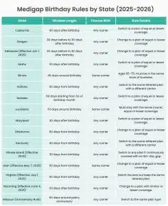 But in some states, there’s a little-known rule that opens the door to more flexibility. Once a year, during a short window tied to your birthday, you may be able to switch to a new Medigap plan without answering health questions or worrying about being denied for pre-existing conditions.